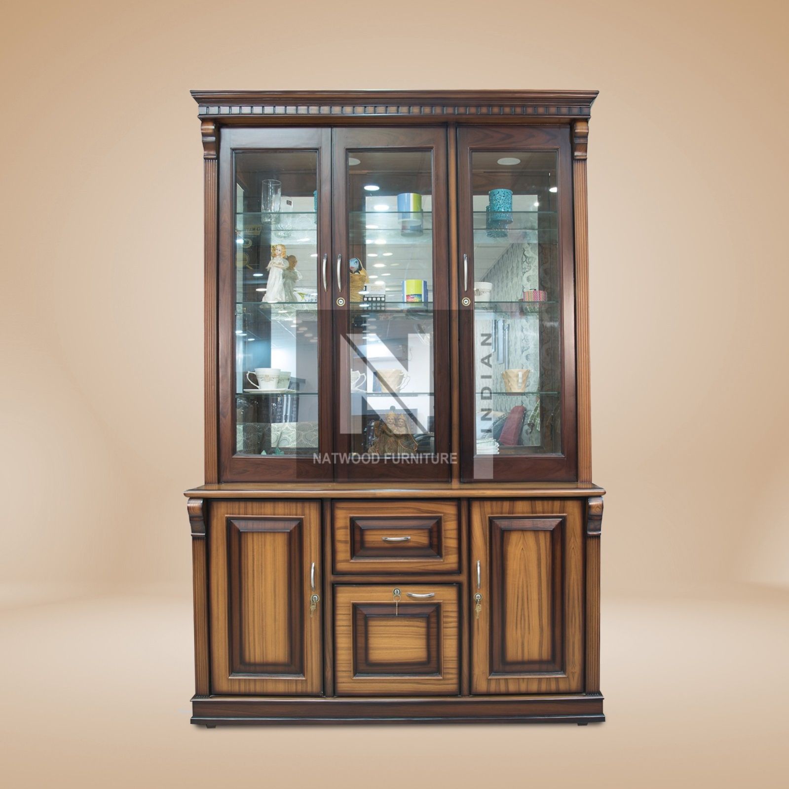 Teak wood three door CROCKERY with three drawers and two doors.