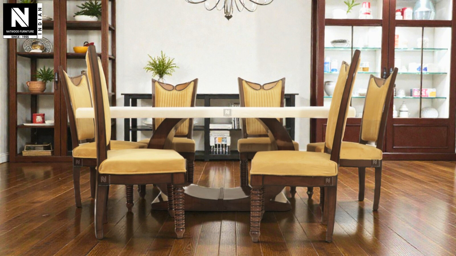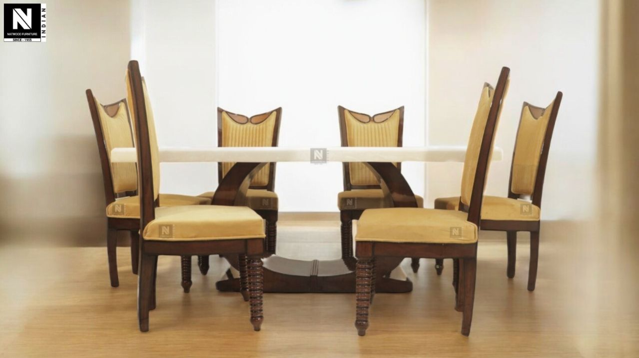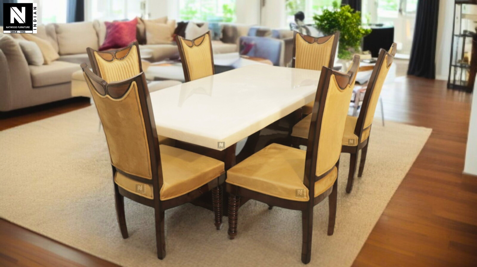 NF CHAND 6SEATER DINING TABLE WITH 66''X36'' ONEX BOX WHITE MARBEL & 6PCS RING PAN CHAIR